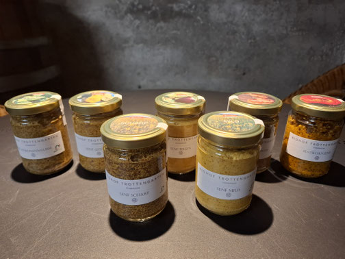 Wir senfen monatlich frisch. Je nach Saison gibt es verschiedene Senfe im Angebot.